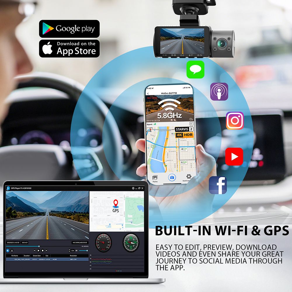 It is a high quality 3 channel dashcam kit developed on Novatek program, used SONY IMX678 camera. Support wifi and GPS.